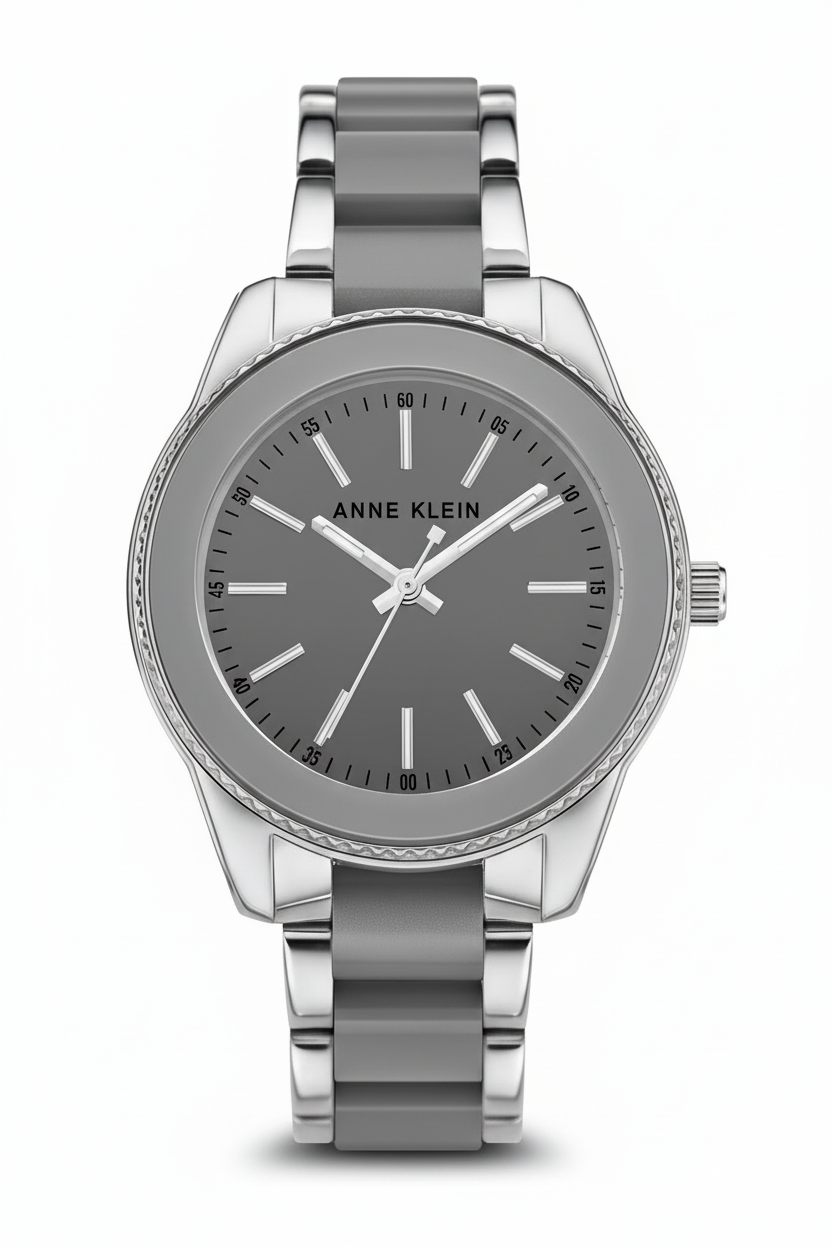 Anne Klein women's quartz watch with a grey dial and polished silver-tone bracelet. Precise quartz movement, mineral crystal glass, and water resistance to 30 meters make it practical for daily wear. Versatile design transitions seamlessly from casual to formal occasions.