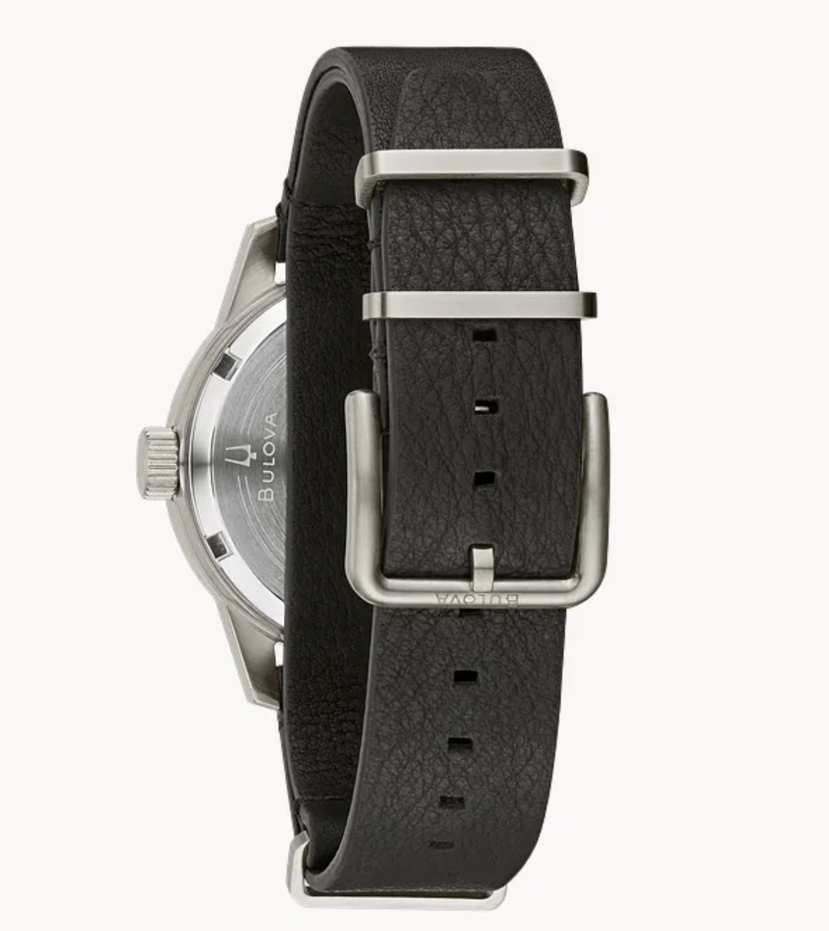 Inspired by Bulova’s military heritage and vintage watches of the time, the Hack Watch infuses historical elements for a contemporary lifestyle. The updated style features a three-hand 21-jewel automatic movement with a 42 hour power reserve. The stainless steel case with an ivory dial and luminescent hands and markers also features a center track on the dial displaying 24H time. Black leather NATO strap. Domed mineral crystal. Water resistance to 30 meters.