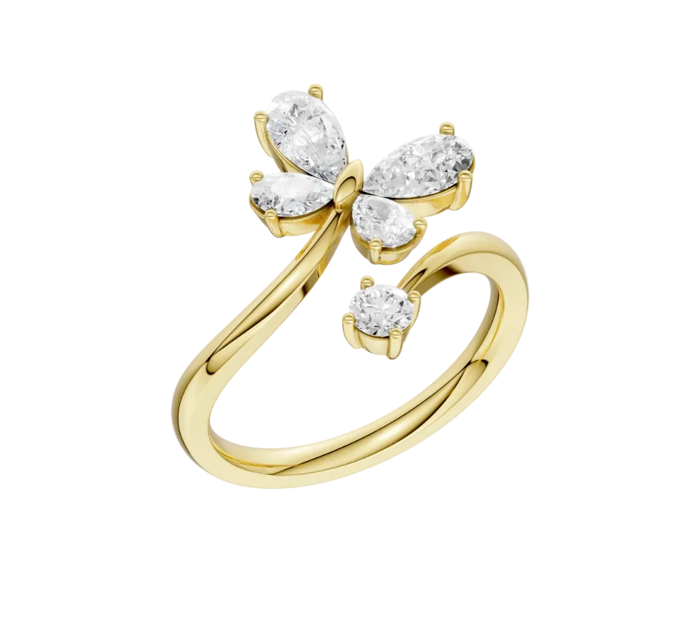 Whimsical elegance takes flight in this butterfly bypass ring, crafted in luminous 14KT yellow gold. Featuring gracefully placed near shaped lab grown diamonds totaling 1.10 carats, the design creates the illusion of delicate butterfly wings wrapping around the finger. A symbol of transformation and beauty, this ring is a captivating statement of refined sparkle and modern charm.
