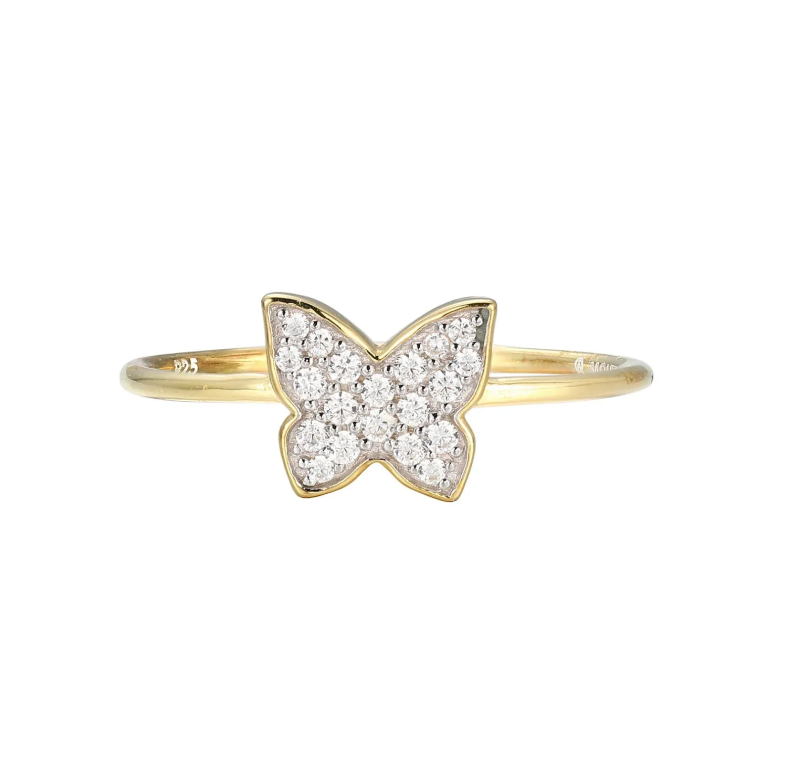 Gold plated on sterling silver. A dazzling diamond butterfly perched atop a high polished band makes this is a delicate, eye catching ring perfect for both the office and a cocktail with your besties!