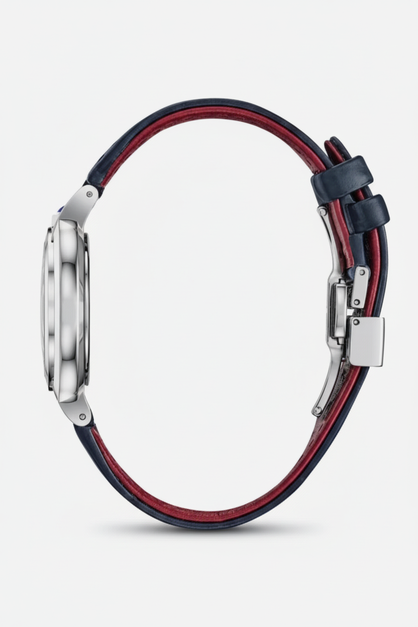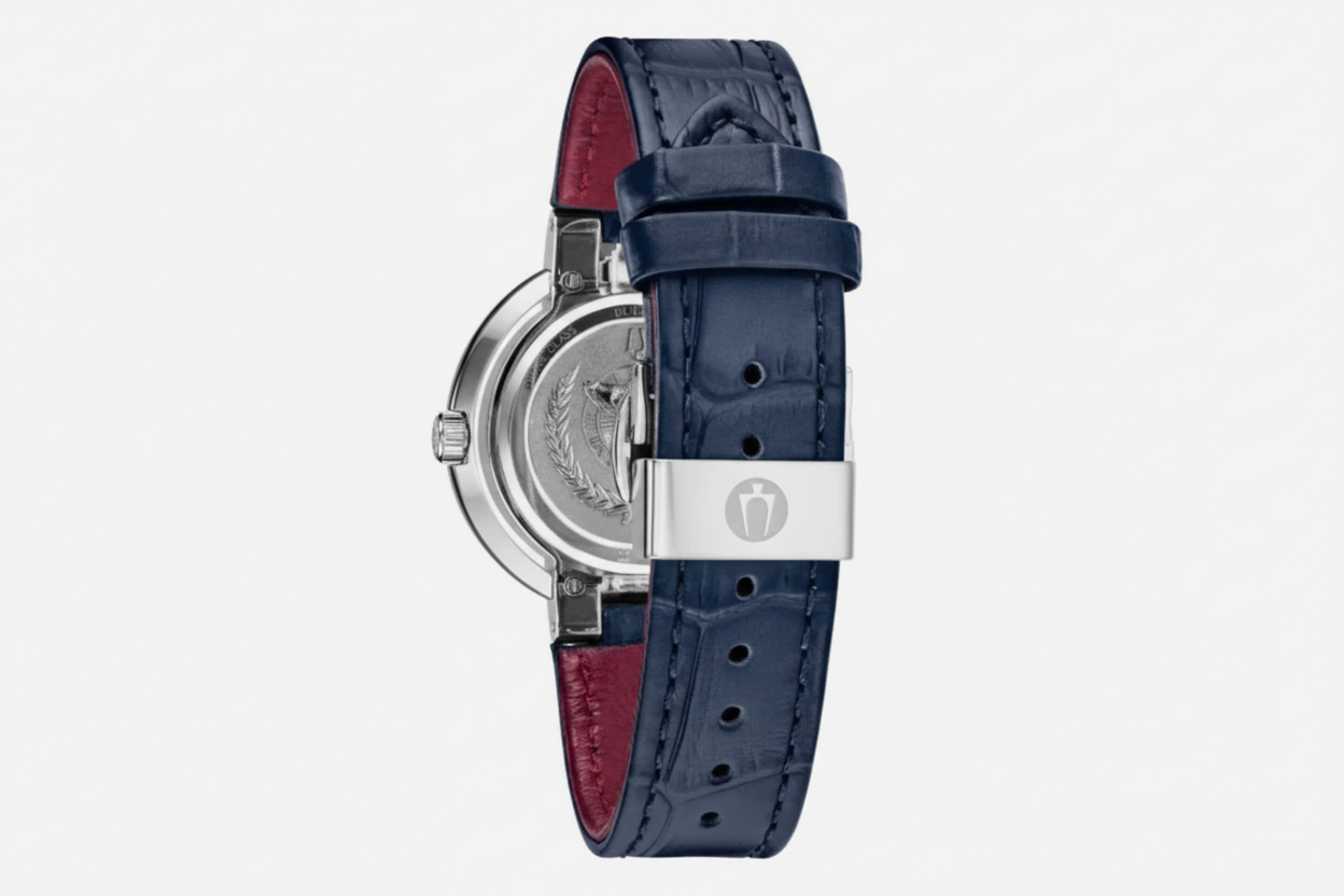 The Rubaiyat Quartz Mother of Pearl Dial Ladies Watch combines timeless elegance with refined craftsmanship. Featuring a luminous mother-of-pearl dial that catches the light beautifully, this timepiece is accented with diamond markers at the 3, 6, and 9 o'clock positions for a touch of luxury. The silver-tone stainless steel case and fixed bezel provide durability and a polished aesthetic, while the analog quartz movement ensures reliable timekeeping. Finished with a leather strap and offering 30-meter water resistance, this watch seamlessly transitions from everyday wear to special occasions. A sophisticated choice for those who appreciate understated glamour and quality horology.